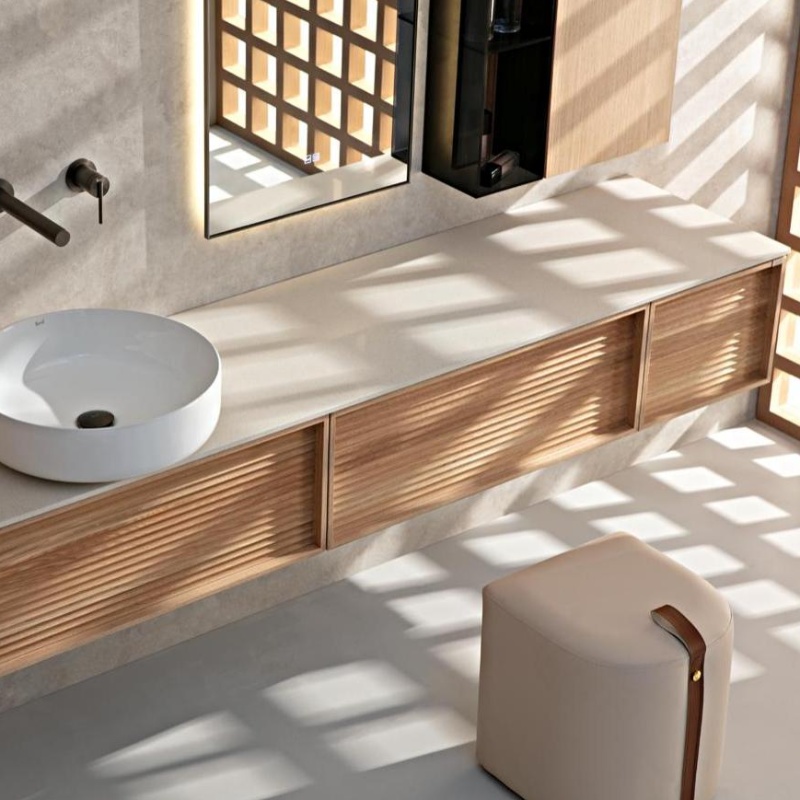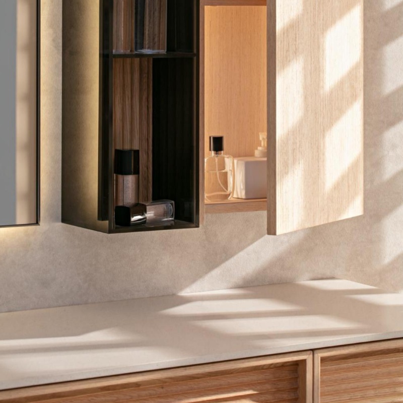 Japanese style yellow wood veneer bathroom cabinet natural marble countertop bathroom shelf