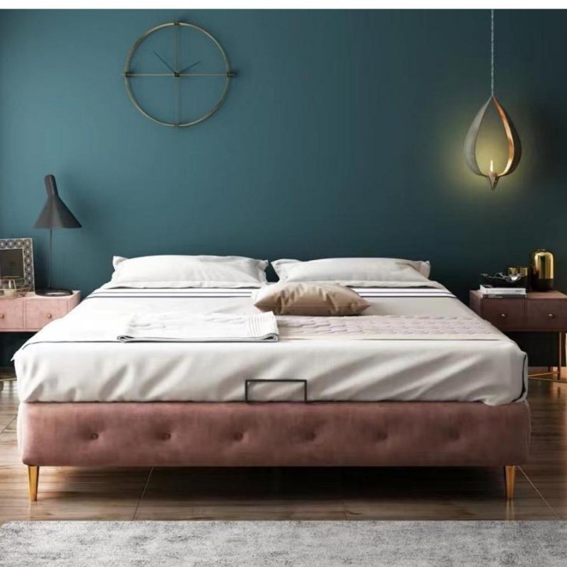Light Luxury Gold Metal Leg Upholstery Cloth Art Double King Queen Full Size Pink Fabric Wooden Frame Bed